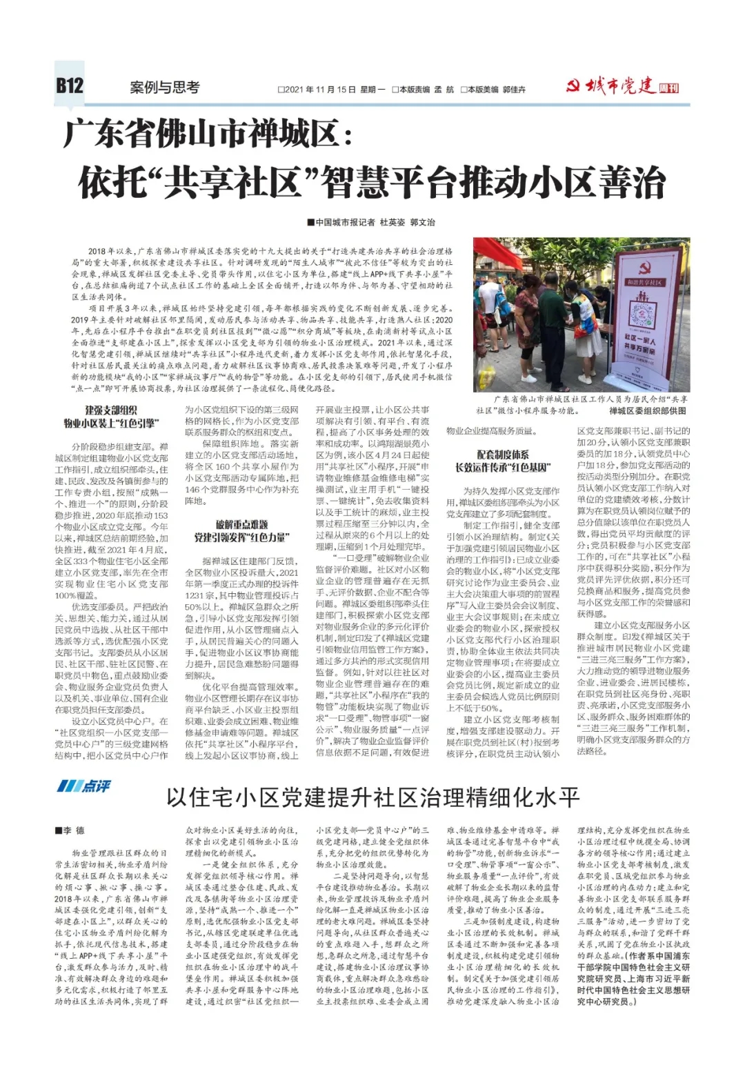 11月15日,在人民日报主办的中国城市报《城市党建》周刊第347期第28版刊登了《广东佛山禅城区:依托“共享社区”智慧平台推动小区善治》。