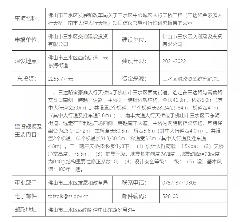 《佛山市三水区发展和改革局关于三水区中心城区人行天桥工程(三达路金豪庭人行天桥、南丰大道人行天桥)项目建议书暨可行性研究报告的公示》