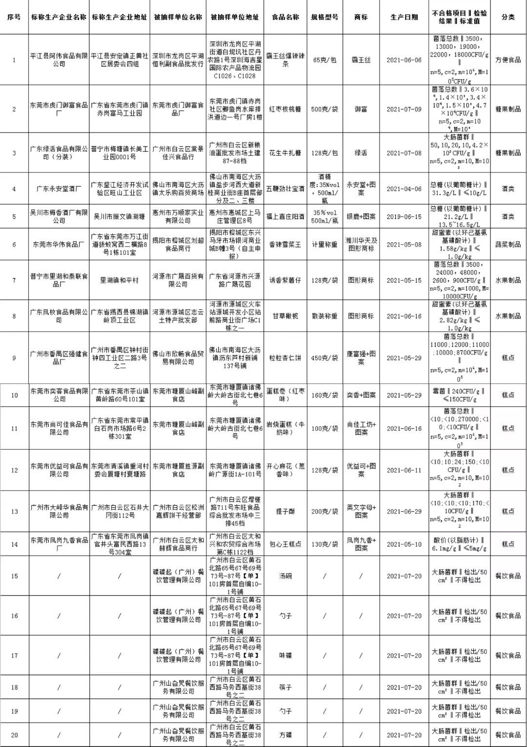 近日,广东省市场监督管理局组织抽检方便食品、冷冻饮品、糖果制品、酒类、蔬菜制品、水果制品、糕点、餐饮食品和食用油、油脂及其制品等9类食品1041批次样品。公布了20批次不合格样品,涉辣条、牛轧糖、麻花等常见零食还有餐具。检出微生物污染、食品添加剂超限量使用及其他指标问题。