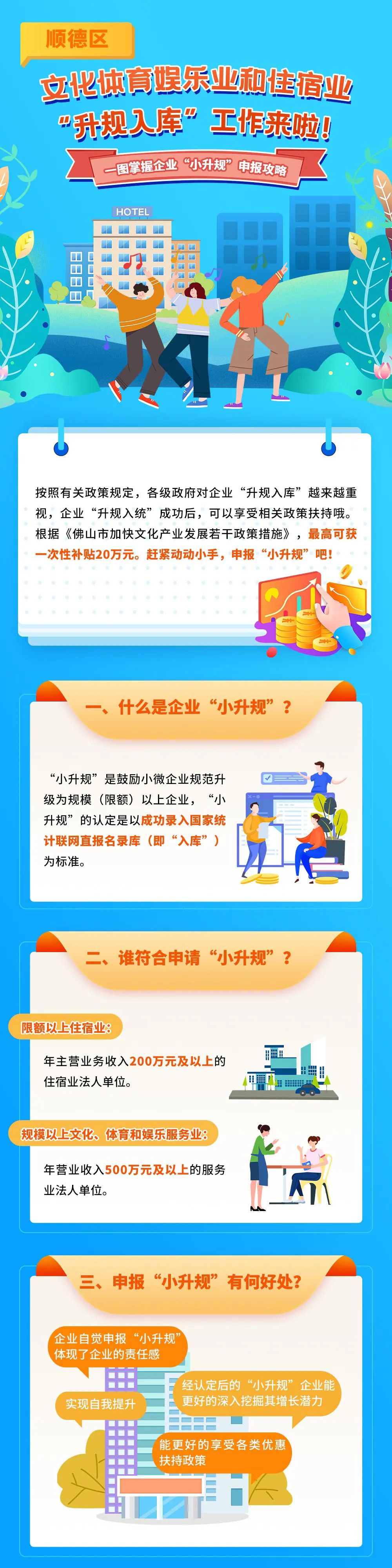 企业“升规入库”后可享受相关政策扶持。根据《佛山市加快文化产业发展若干政策措施》,文化服务企业年营业收入首次超过500万元并进入国家统计局联网直报平台的,有机会获得一次性补贴20万元。具体申领攻略如下: