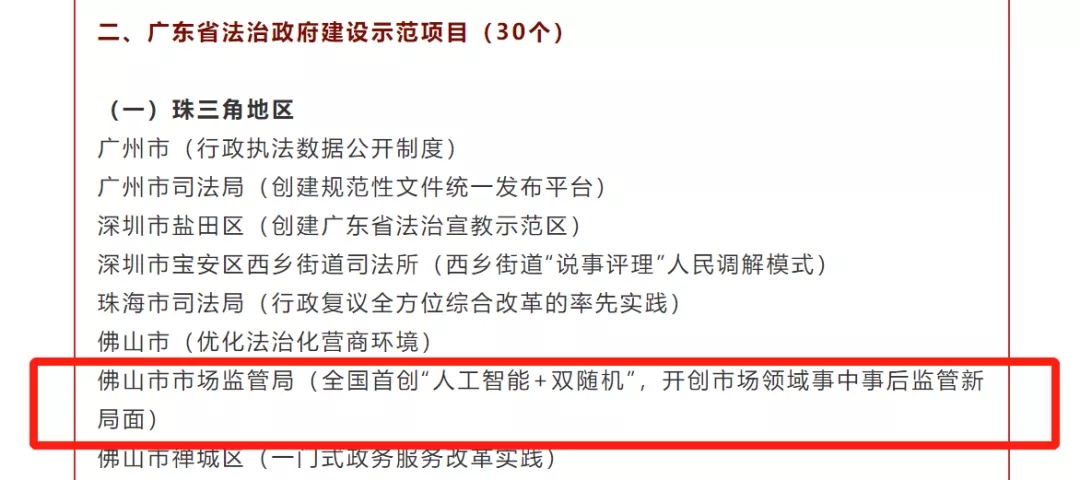其中,佛山市市场监管局榜上有名,“全国首创'人工智能+双随机',开创市场领域事中事后监管新局面”项目被拟命名为广东省法治政府建设示范项目。
