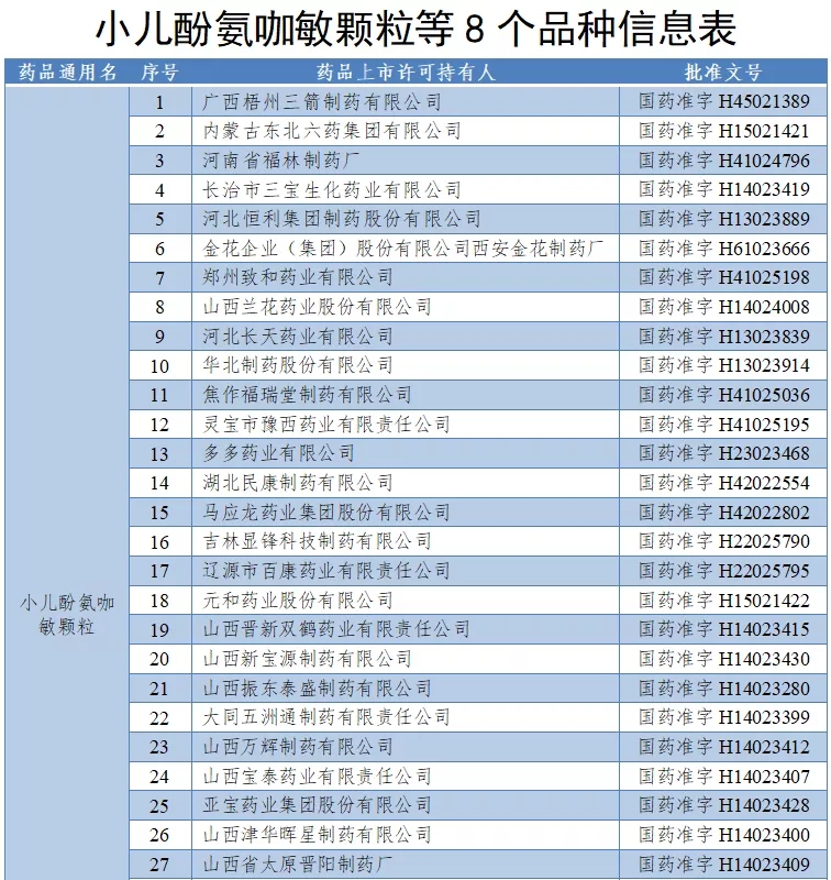 公告指出,根据《中华人民共和国药品管理法》第八十三条等有关规定,国家药品监督管理局组织对小儿酚氨咖敏颗粒、氨非咖片、复方氨基比林茶碱片、氨林酚咖胶囊、氨咖敏片、丁苯羟酸乳膏、小儿复方阿司匹林片、氨非咖敏片等8个品种开展了上市后评价。