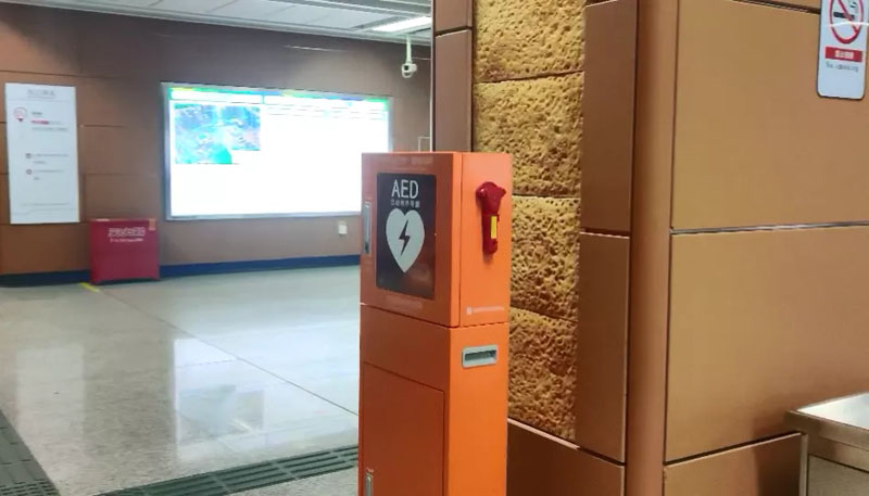 在广佛线新城东站,该站D出口的车站控制室对面摆放着一台来自佛山市医疗急救指挥中心、外表为橙红色的AED,上面标示着“当门打开时,警报鸣响”。