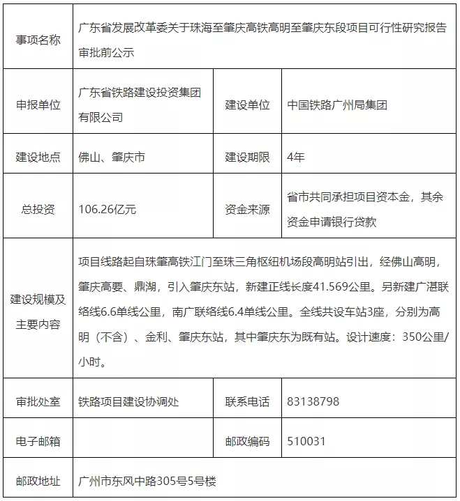 此次公示显示,珠海至肇庆高铁高明至肇庆东段项目还将新建广湛联络线和南广联络线,未来将可实现与广湛高铁、南广铁路的快速连接。