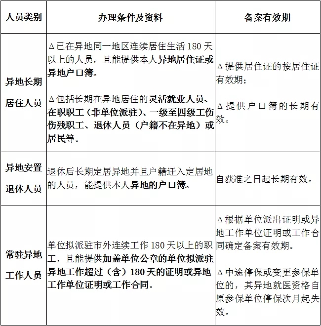 1、异地长期居住人员如不能出具居住证的,可提供当地公安部门出具的当地居住超过180天的证明材料或居住地村(居)委员会(含社区工作站)出具的长期异地居住超过180天的证明材料来申请长住异地就医业务。
