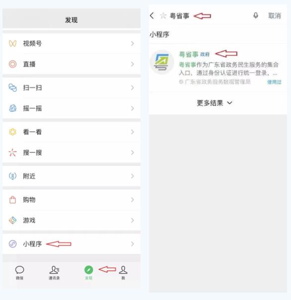 01、打开微信,点击“发现”,进入“小程序”,搜索“粤省事”;