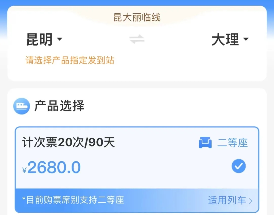 昆明至大理20次/90天计次票,二等座价格为2680元。