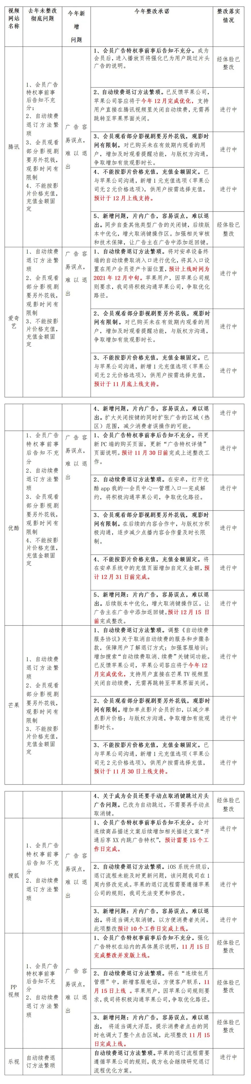 浙江省消保委消费调查监督部主任李嘉表示,这段时间,他与各视频网站保持紧密沟通,从7家视频网站的整改进展情况来看,不少网站整改迅速;从承诺情况来看,大部分网站整改事项将于11月底或12月中旬完成,请广大消费者共同监督。