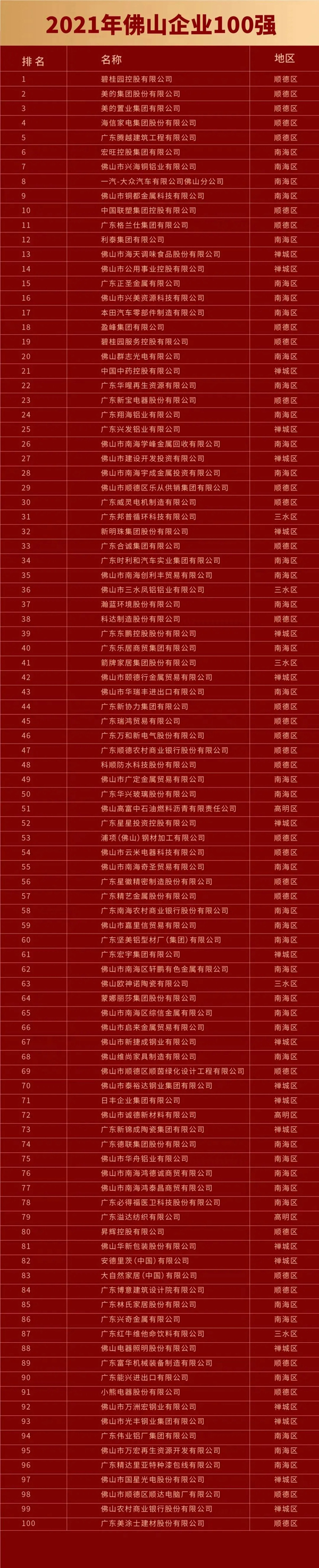 佛山第一个百强企业榜单在2019年由佛山市企业联合会、佛山市企业家协会发布。今年,“佛山企业100强”榜单第三次发布,“佛山制造业100强”榜单首次发布。