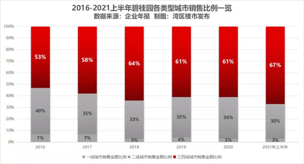 碧桂园在三四线城市的销售比例越来越高,至2021年达到峰值,67%的销售金额来自三四线城市。