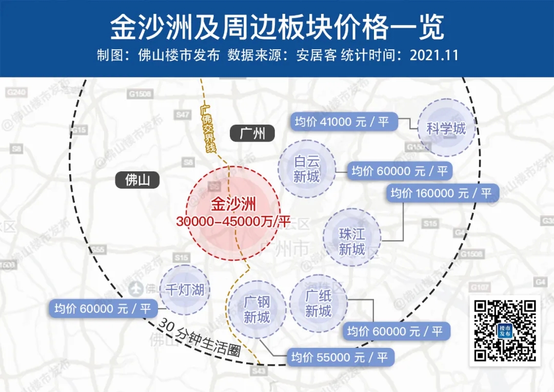 金沙洲30分钟生活圈内,千灯湖新房破6万/平,白云新城房价6-12万/平,珠江新城均价更达16万/平,在整个临广板块可以说是洼地般的存在。