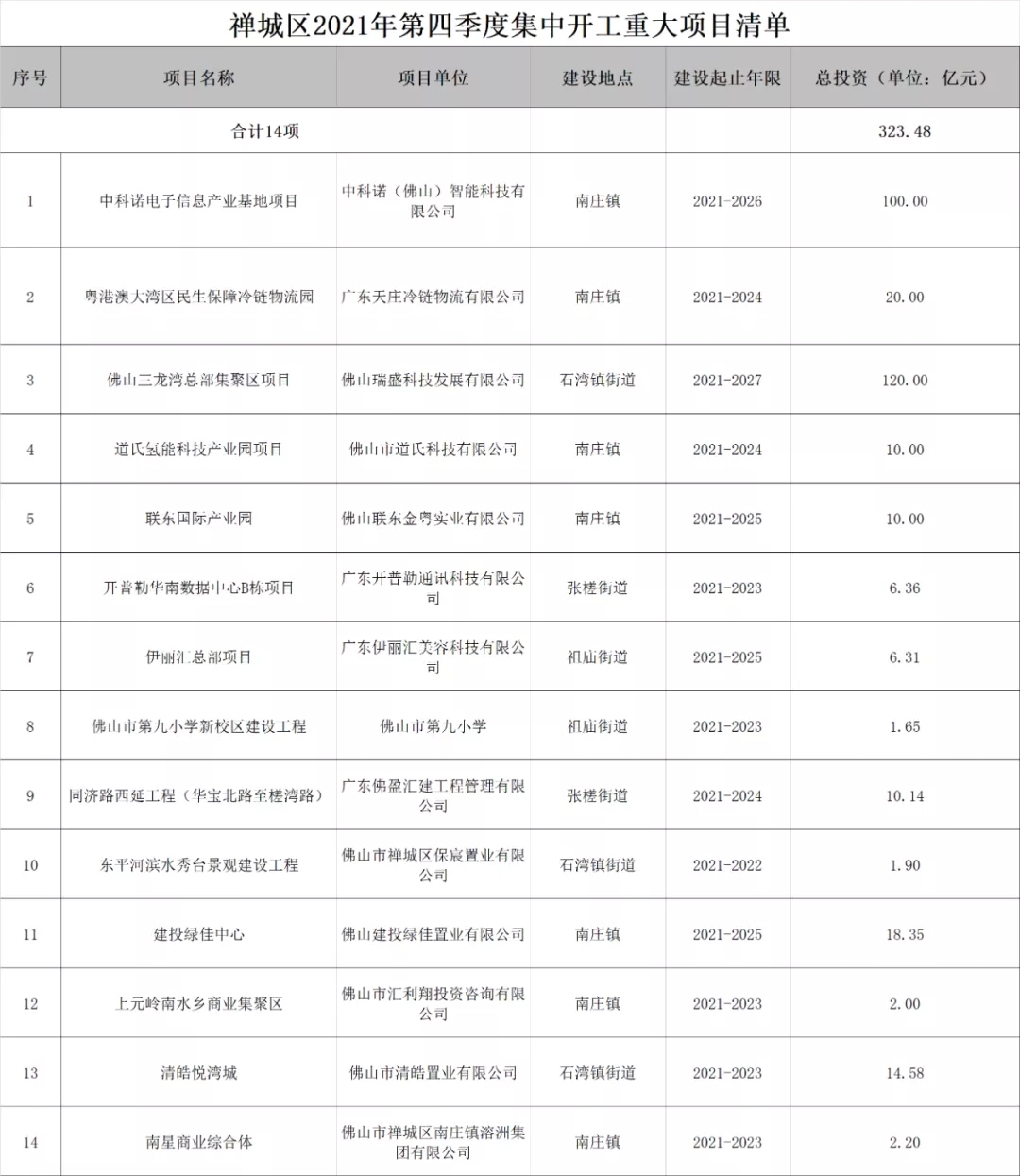 此次禅城共有14个重大项目集中开工,包括产业项目、基础建设和民生类项目,项目总投资323.48亿元。