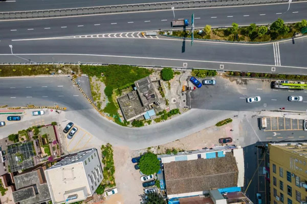 建筑拆除后,原弯曲的辅道拉直建成三车道