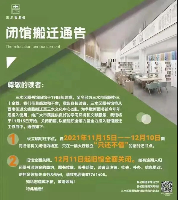 新馆地址:三水区云东海街道荷湖南路1号2座(三水文化中心2座)