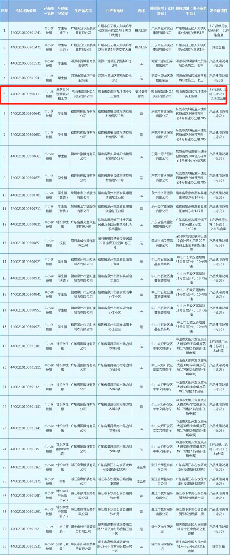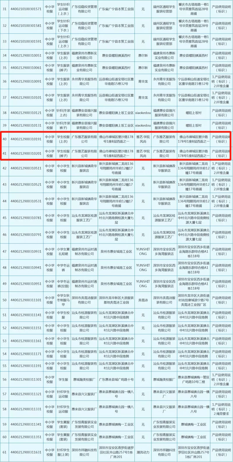 对115家企业生产的501款中小学生校服