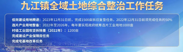 九江镇要坚决落实开展全域土地综合整治的决策部署,以争当城乡融合发展先行区的勇气和志气,围绕腾退、攻坚、连片、联合四个方面,精准实干,坚决把各项任务落到实处。