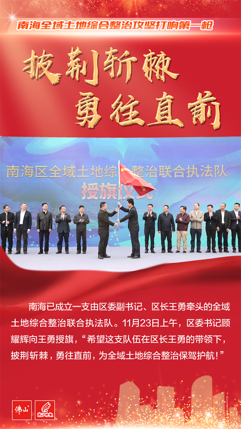 会议现场,顾耀辉向王勇授旗,宣告南海区全域土地综合整治联合执法队的成立。为配合相关工作开展,南海区特意成立这支队伍,为南海的升级改造保驾护航。王勇表示,南海要有走在前列的改革志气、放眼湾区的格局大气、蓄势待发的发展底气、制造强区的投入豪气、披坚执锐的斗争勇气、干群并肩的协作和气,坚持这六种士气,南海未来一定更加辉煌。