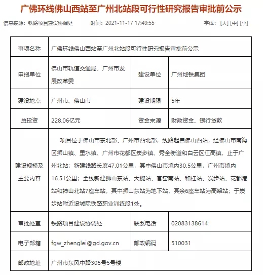 11月17日,广东省发改委发布了《广佛环线佛山西站至广州北站段可行性研究报告审批前公示》,建设期限为5年。