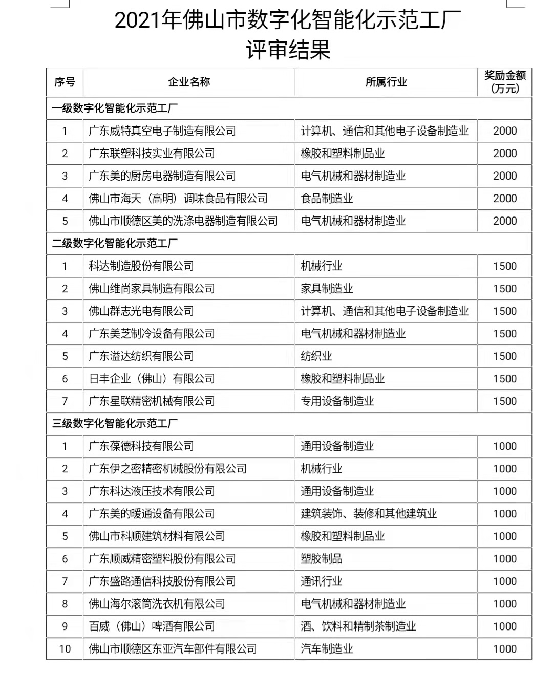 在此次公示的评审结果中,威特真空、联塑科技、美的厨房电器、海天味业、美的洗涤电器等5家企业获评一级数字化智能化示范工厂,拟获得2000万元奖励。科达股份、维尚家具等7家企业获评二级数字化智能化示范工厂,拟获得1500万元奖励。葆德科技、伊之密等10家企业获评三级数字化智能化示范工厂,拟获得1000万元奖励。