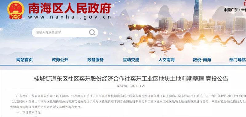 11月25日,南海区政府发布奕东工业区前期整理竞投公告,将改造成商住用地,预计12月29日进行竞投。
