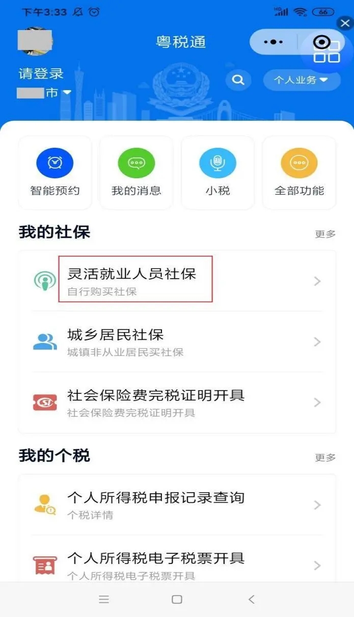 用户通过手机微信关注“广东税务”微信公众号“微办税”,或者直接搜索“粤税通”小程序,进行实名制认证登录后,进入“灵活就业人员社保”界面。
