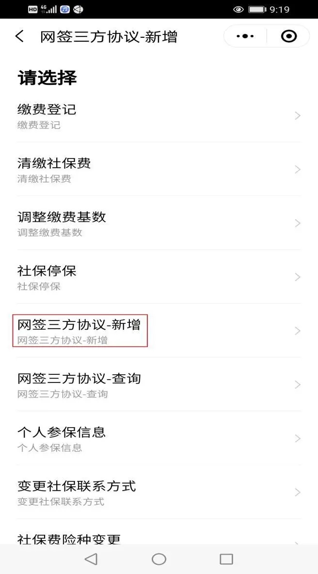 进入“灵活就业人员社保”界面后,点选“网签三方协议-新增”菜单,阅读并确认《网签授权协议》的条款内容。