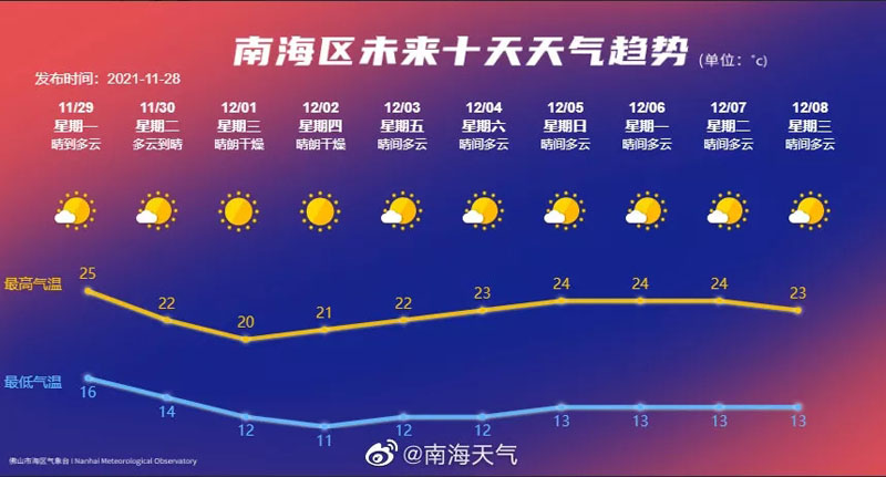 南海区气象台预计,29日夜间到30日冷空气南下影响,云量有所增多,多云到晴,南海区最高气温下降3℃左右。