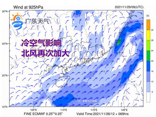 @广东天气 预计,11月29日-12月2日,广东维持晴朗干燥的天气,昼夜温差大,早晚寒冷。其中,29日气温小幅上升,30日-12月2日,受中等强度冷空气影响,全省日平均气温将下降4~6℃,2日早晨粤北将有3~5℃的低温,高海拔山区1℃左右。