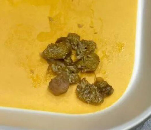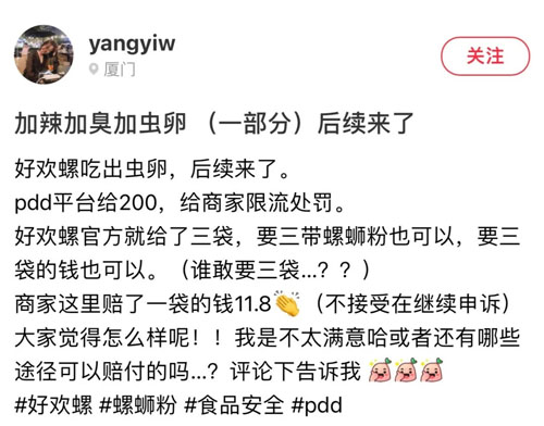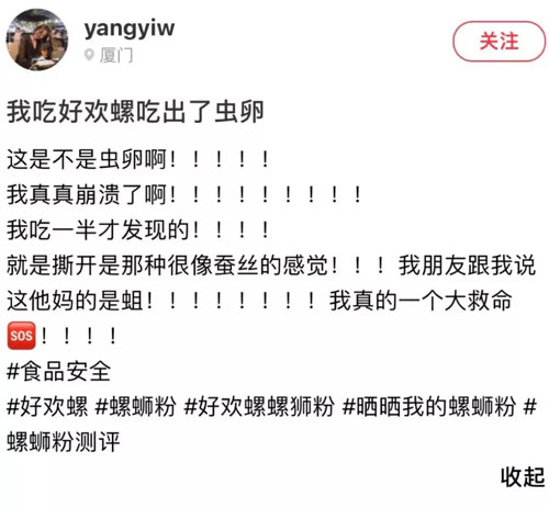 其发布的信息称,自己制作好欢螺螺蛳粉时,并未发现其中的虫卵。吃到一半突然发现一团白色条状物,“撕开像蚕丝”,疑似虫卵。网友表示自己已经催吐。