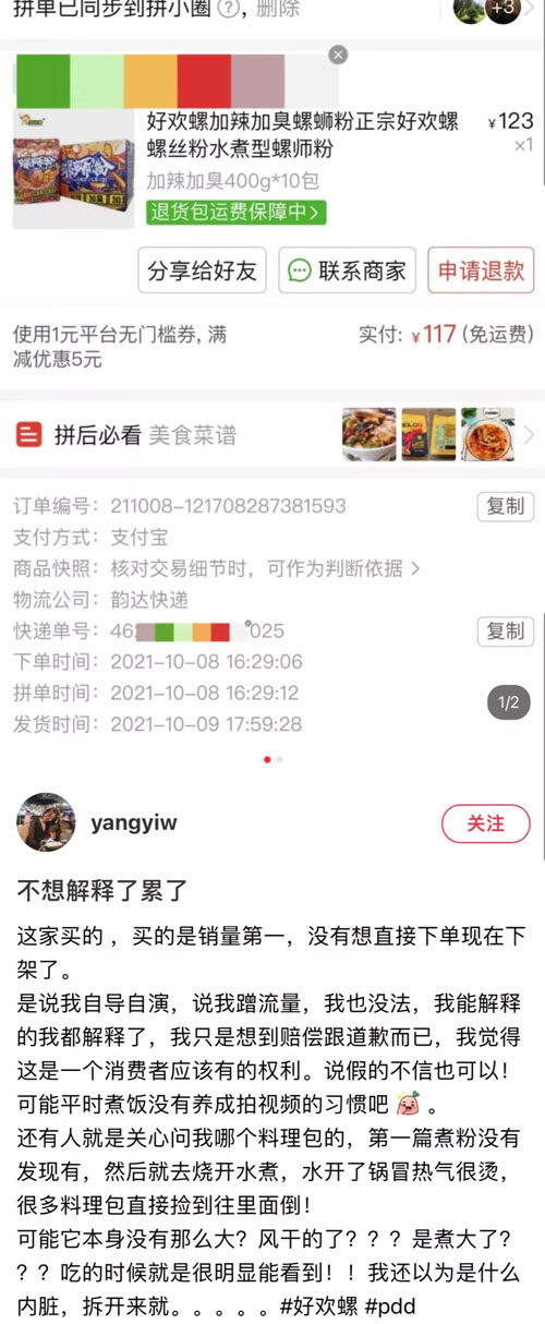 此后,面对“自导自演”“蹭流量”的质疑,该网友又发一帖,称自己是在销量第一的店铺中购买,并提供了订单截图。