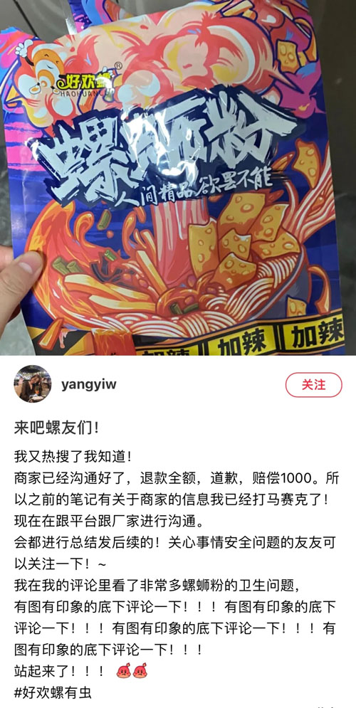 网友在小红书平台发帖,称自己食用好欢螺螺蛳粉时发现虫卵。