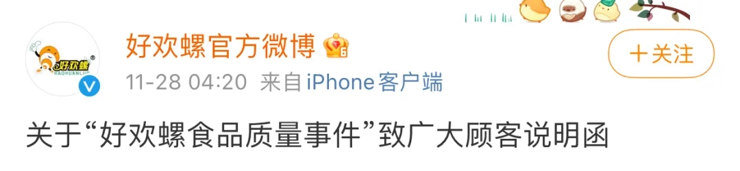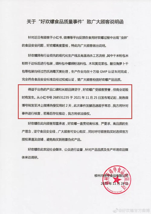 关于“好欢螺食品质量事件”致广大顾客说明函