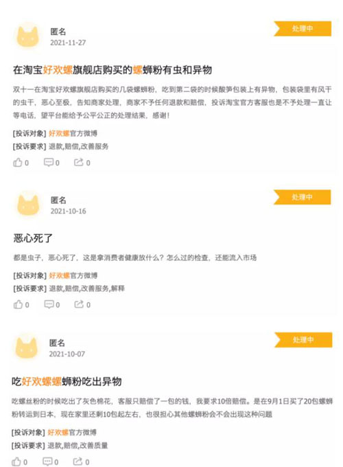 据悉,小红书网友的遭遇不是个例。黑猫投诉平台显示,截至目前,好欢螺共接到54宗投诉,其中不乏有消费者反映螺蛳粉内出现虫子、异物等。