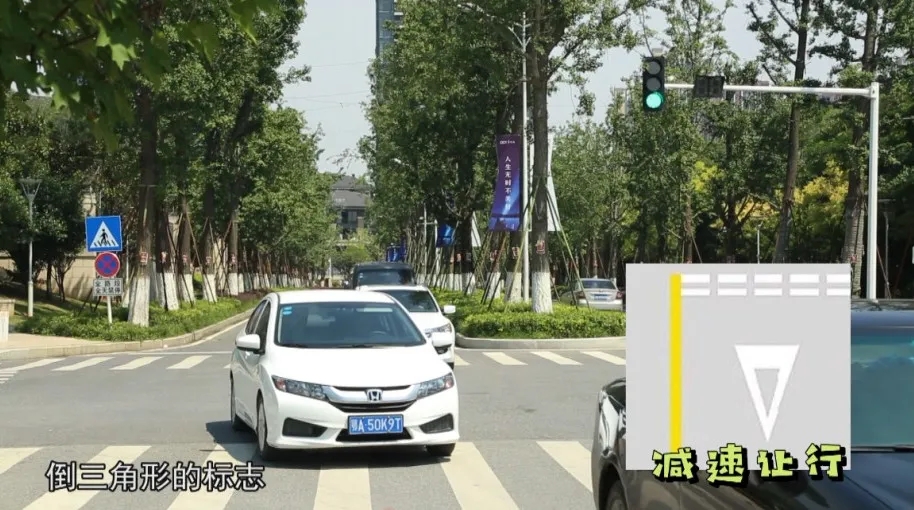 一般是施划于路面的三角标志,提示驾驶人减速,让主路车辆先行。