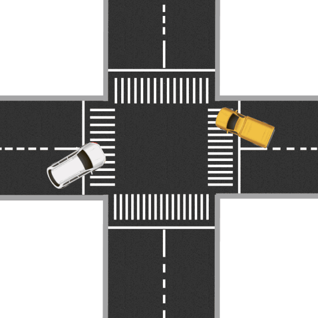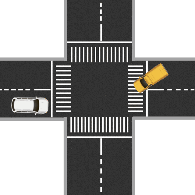 值得注意的是,在没有红绿灯的路口,两辆车交叉方向直行,直行车需让右侧车先通行。
