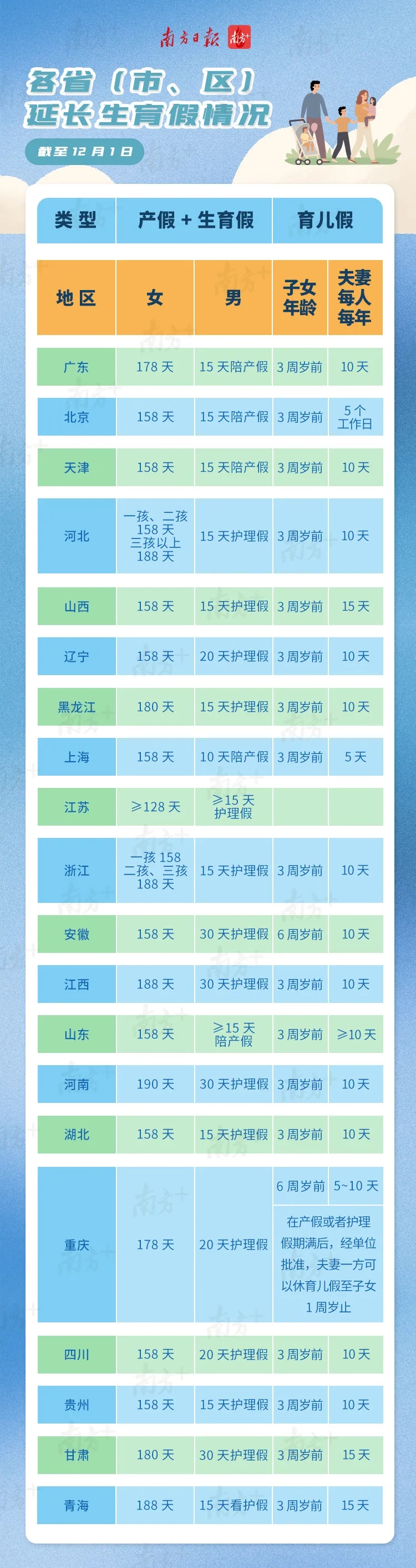 截至12月1日,全国20多个省(市、区)陆续表决通过修改人口与计划生育条例的决定,其中,延长生育假、新增育儿假的情况引人关注,具体情况如下: