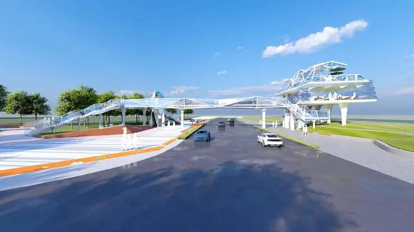 根据设计方案,该项目分桥段及全景驿站平台,天桥主桥长39.45米,桥宽为4.75米,全景驿站面积约为359平方米。全桥采用钢结构,采取晶石造型,宛如东平河畔的一颗闪亮钻戒。