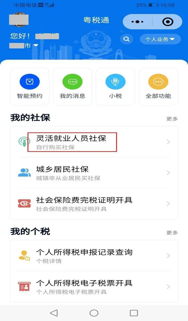 用户通过手机微信关注“广东税务”微信公众号“微办税”,或者直接搜索“粤税通”小程序,进行实名制认证登录后,进入“灵活就业人员社保”界面。
