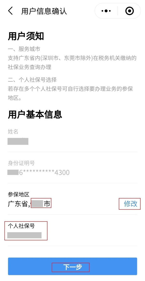 进入“灵活就业人员社保”界面后,点击“社保停保”菜单,系统自动查出参保人的基本信息,参保人确认信息无误后,点击【下一步】(温馨提示:参保人如存在多个个人社保号的,请自行选择要办理业务的参保地区及个人社保号)。