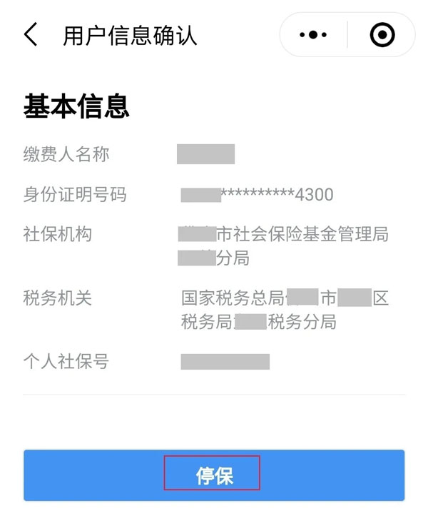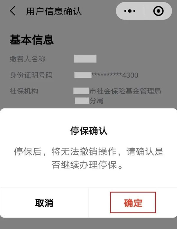 参保人再次确认系统带出的基本信息,核实信息无误后,点击【停保】按钮,【确定】停保(温馨提醒:参保人确认办理停保时,其网签授权划缴税(费)协议将自动终止)。