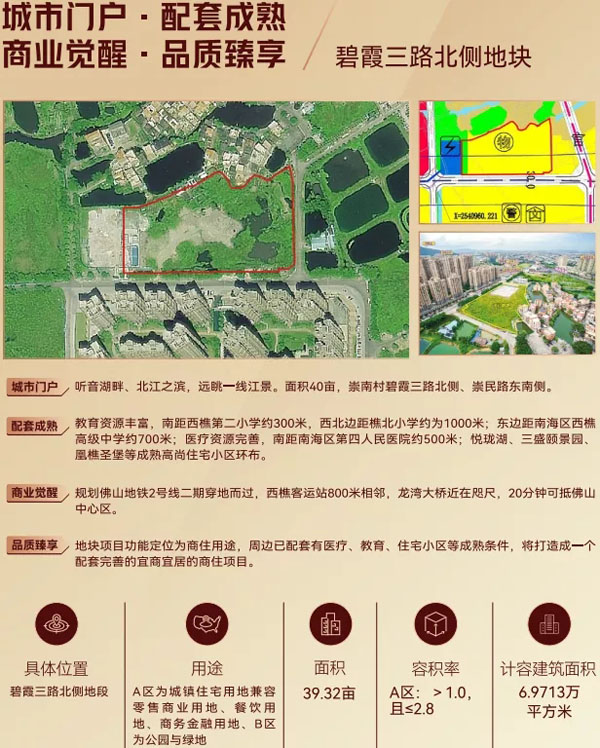 本次土地推介会旨在抓住佛山中心城区扩容机遇,进一步推动“七湖两湾一站一园”重点区域优质居住用地出让工作,为高标准高质量建设城市新空间,打造与先进制造业核心区相匹配的高品质城市环境提供载体与动能,全面打造现代化活力新南海。