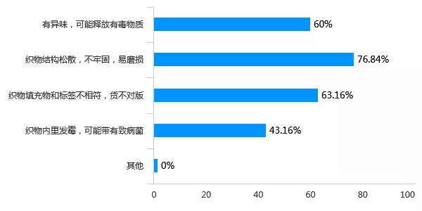 根据调查结果显示,有54.74%受访者认为市场上的床上用品质量一般,存在部分问题。其中,以织物易磨损、织物填充物与标签不相符、床上用品含异味问题最为常见。