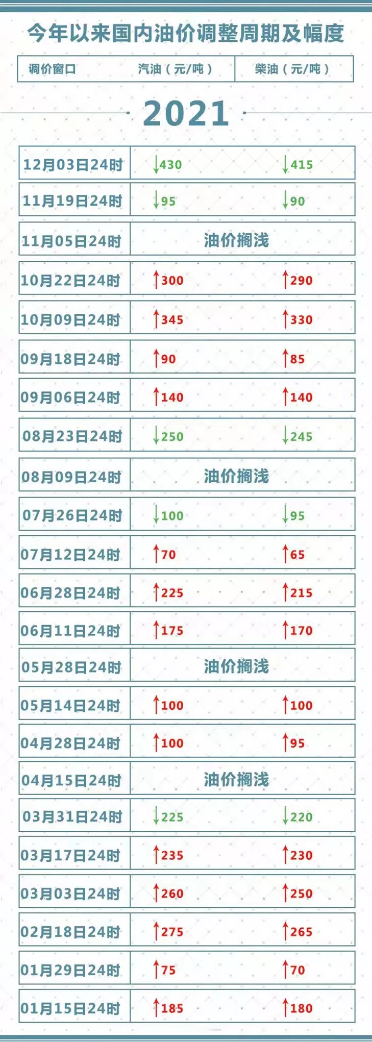 2021年,国内成品油调价已呈现“十四涨五跌四搁浅”的格局。截至本次调价,汽油价格累计每吨上调1475元,柴油价格累计每吨上调1420元。