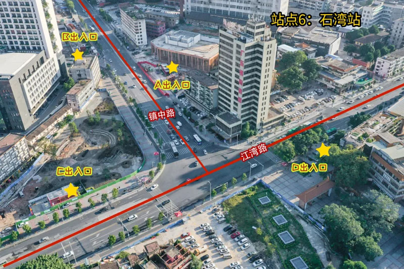 石湾站位于镇中路与江湾路交界处,设有A、B、C、D四个出入口。