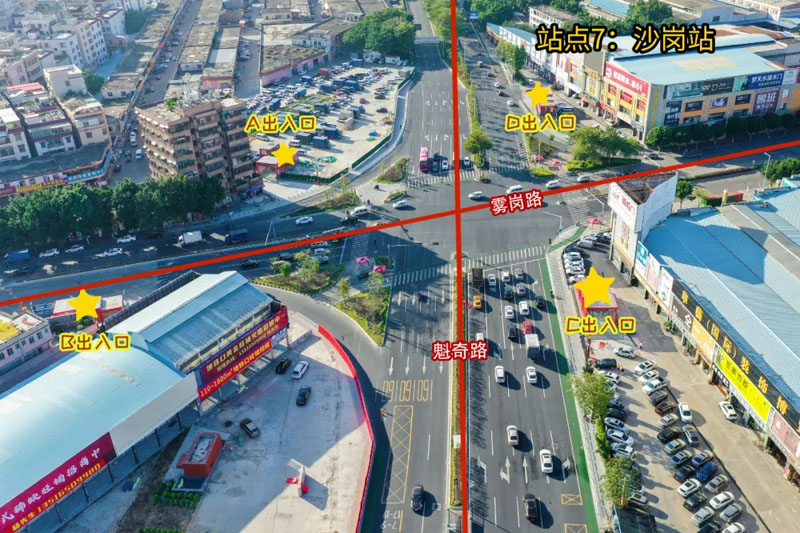 沙岗站位于魁奇路与雾岗路交界处,设有A、B、C、D四个出入口。
