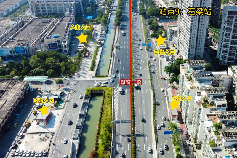 石梁站位于魁奇一路与金澜北路交界处,设有A、B、C、D四个出入口。