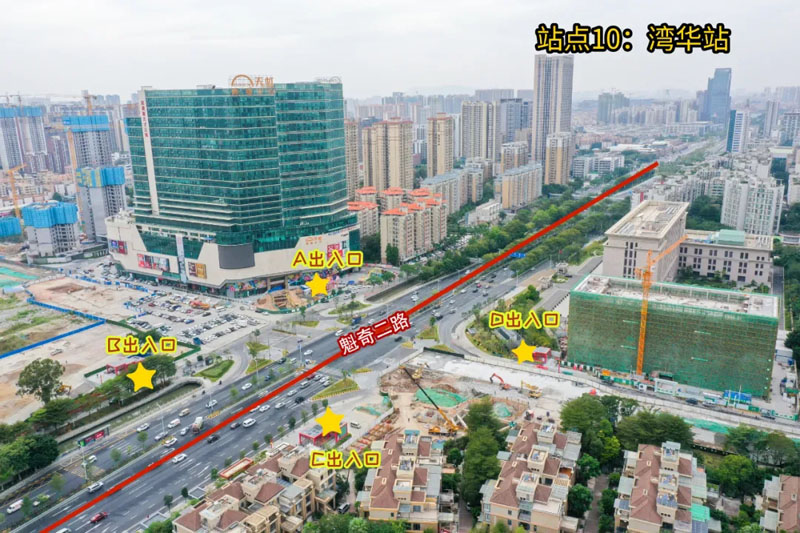 湾华站位于魁奇二路与文华中路交界处,设有A、B、C、D四个出入口。