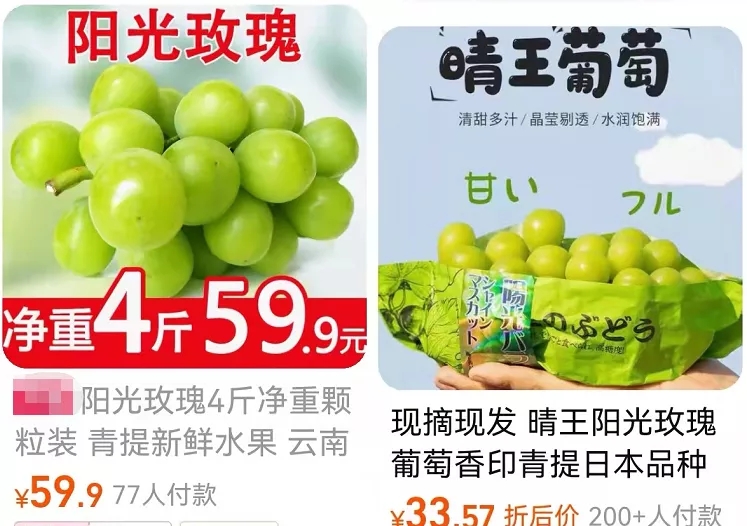 在电商平台查看发现,多数商品销售页面都会同时标注“晴王”和“阳光玫瑰”两个名称。有的店铺甚至标注了阳光玫瑰葡萄,强调自家产品非日本进口,又注明“韩国”字样,同时图片上又大字注明“云南晴王”;有的店铺还会再标注“香印青提”。