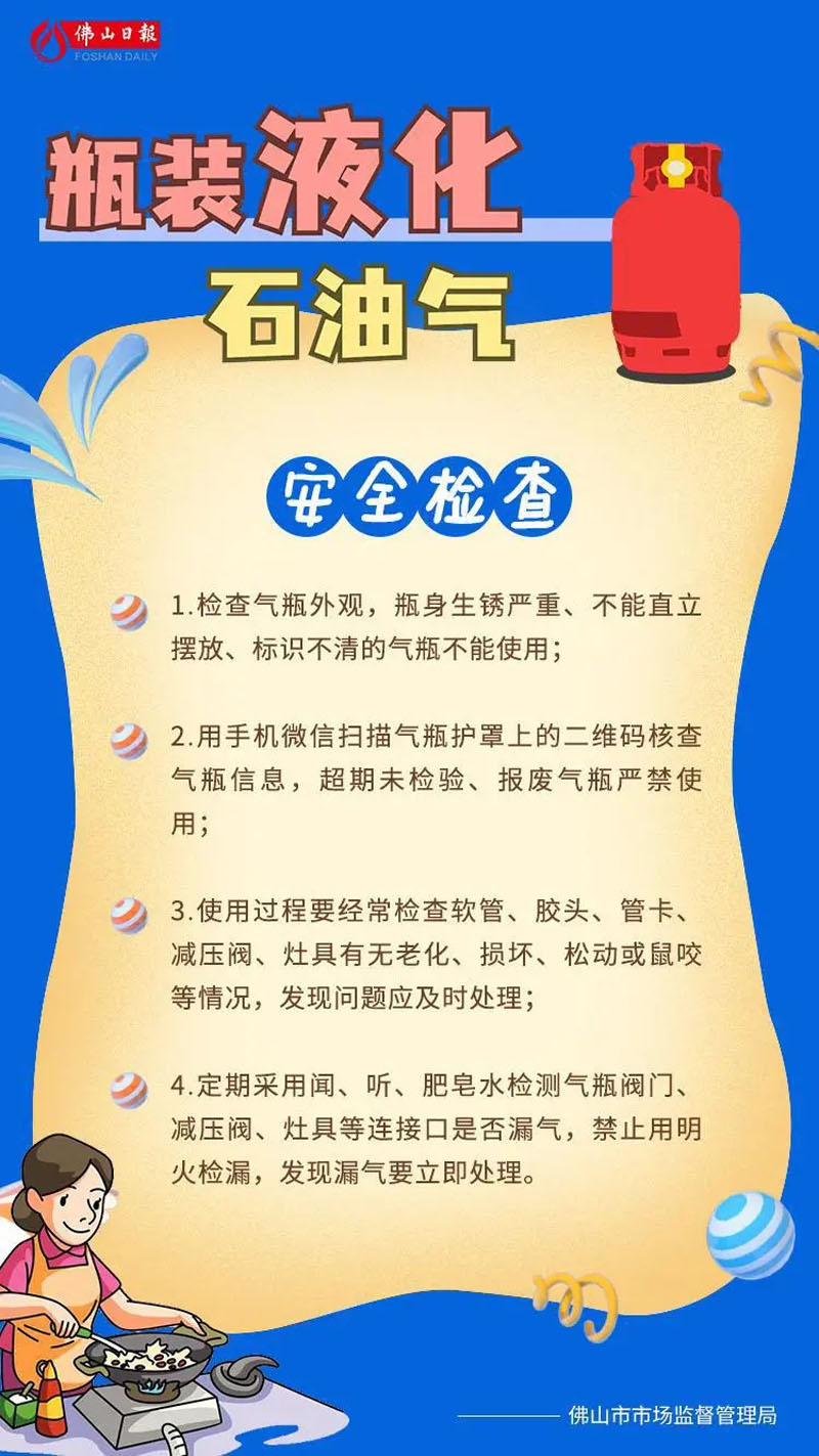 为提升瓶装液化石油气的安全使用水平,保障市民生命财产安全,佛山市市场监督管理局联合佛山日报社推出《瓶装液化石油气安全使用小贴士》系列海报。