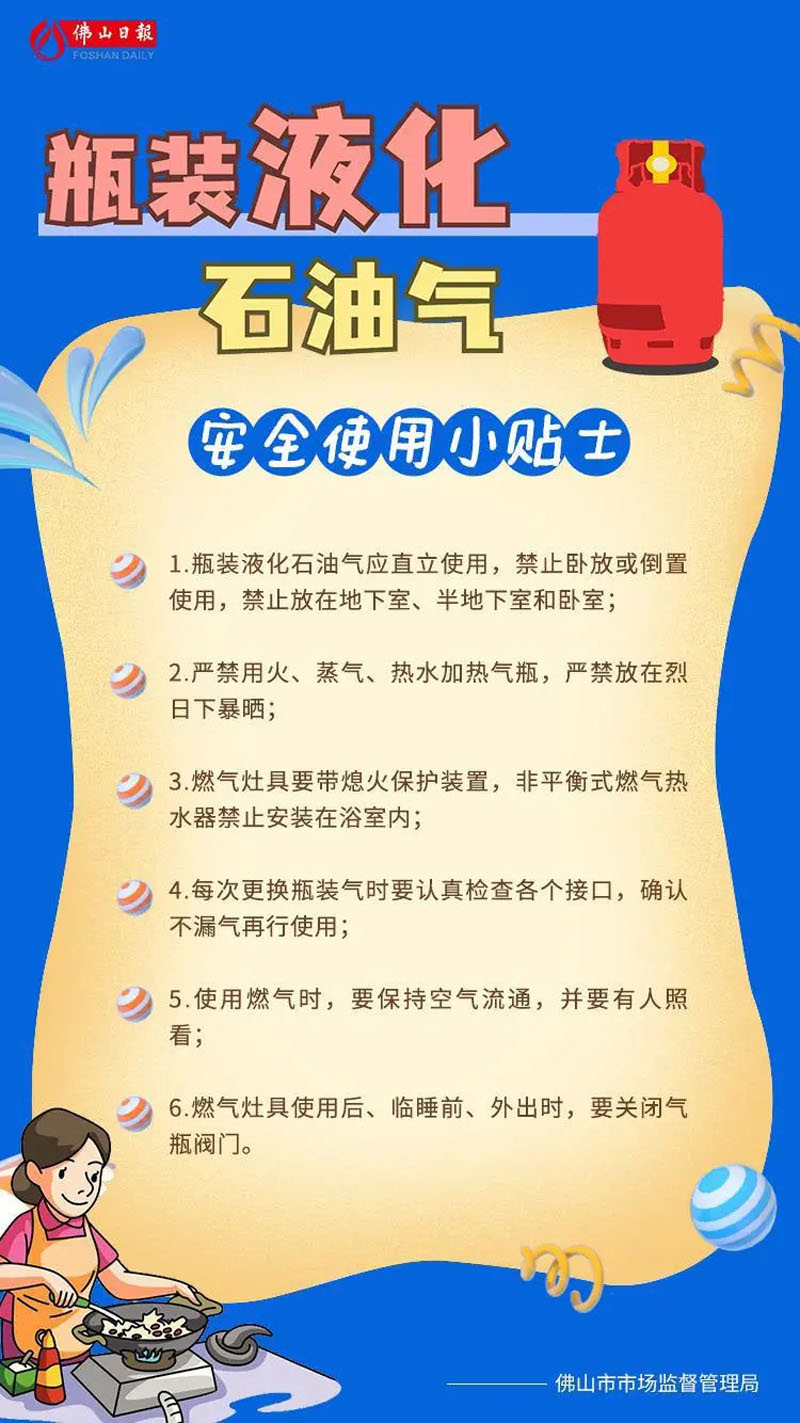 为提升瓶装液化石油气的安全使用水平,保障市民生命财产安全,佛山市市场监督管理局联合佛山日报社推出《瓶装液化石油气安全使用小贴士》系列海报。